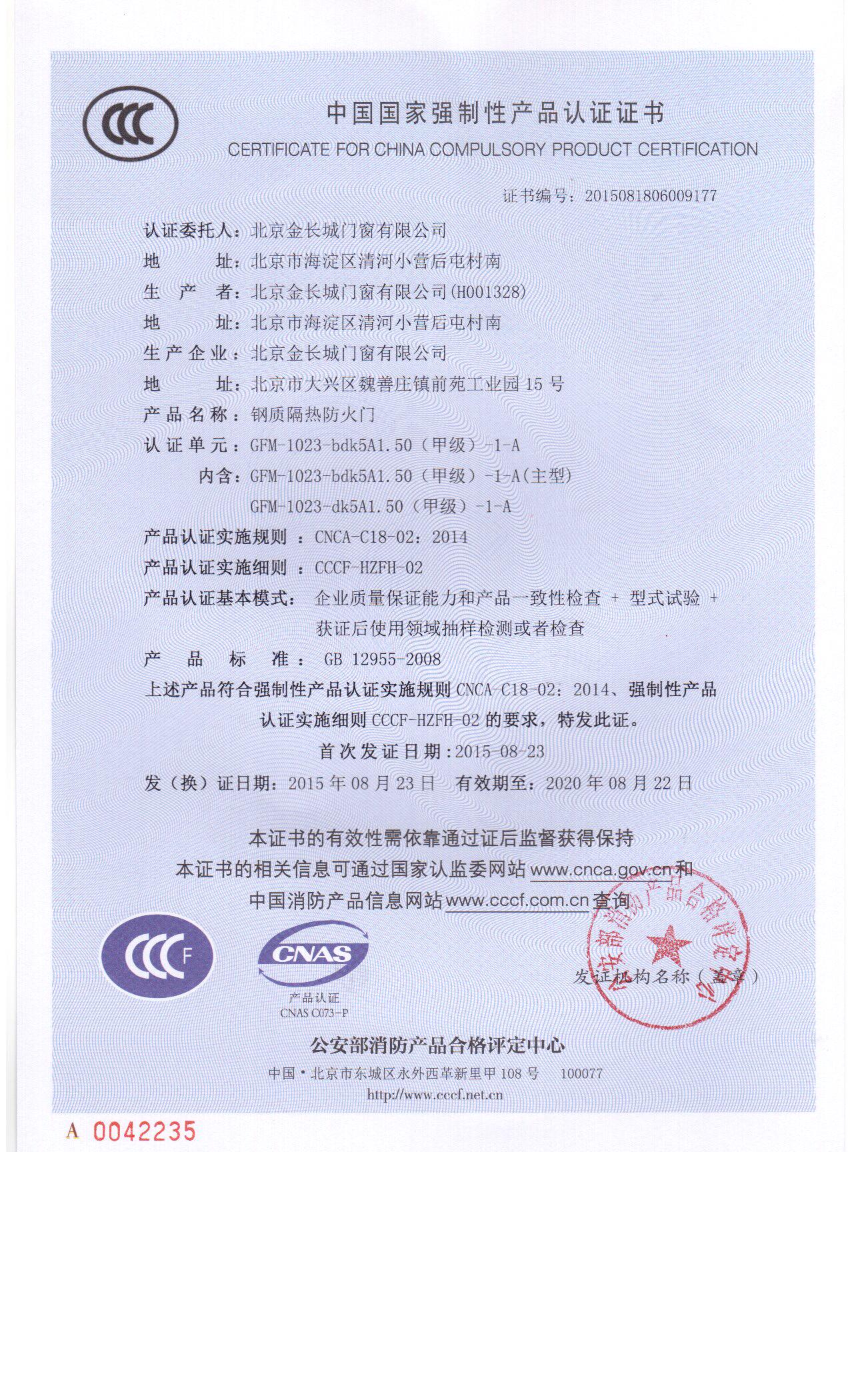 長城防火門廠防火門產(chǎn)品CCC認(rèn)證通過